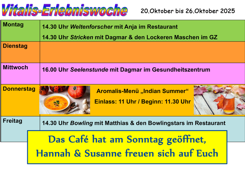 Möchten Sie gerne wissen, was diese Woche auf dem Speiseplan steht und was das Erlebnisrestaurant zu bieten hat, dann klicken Sie hier: Erlebnisrestaurant.